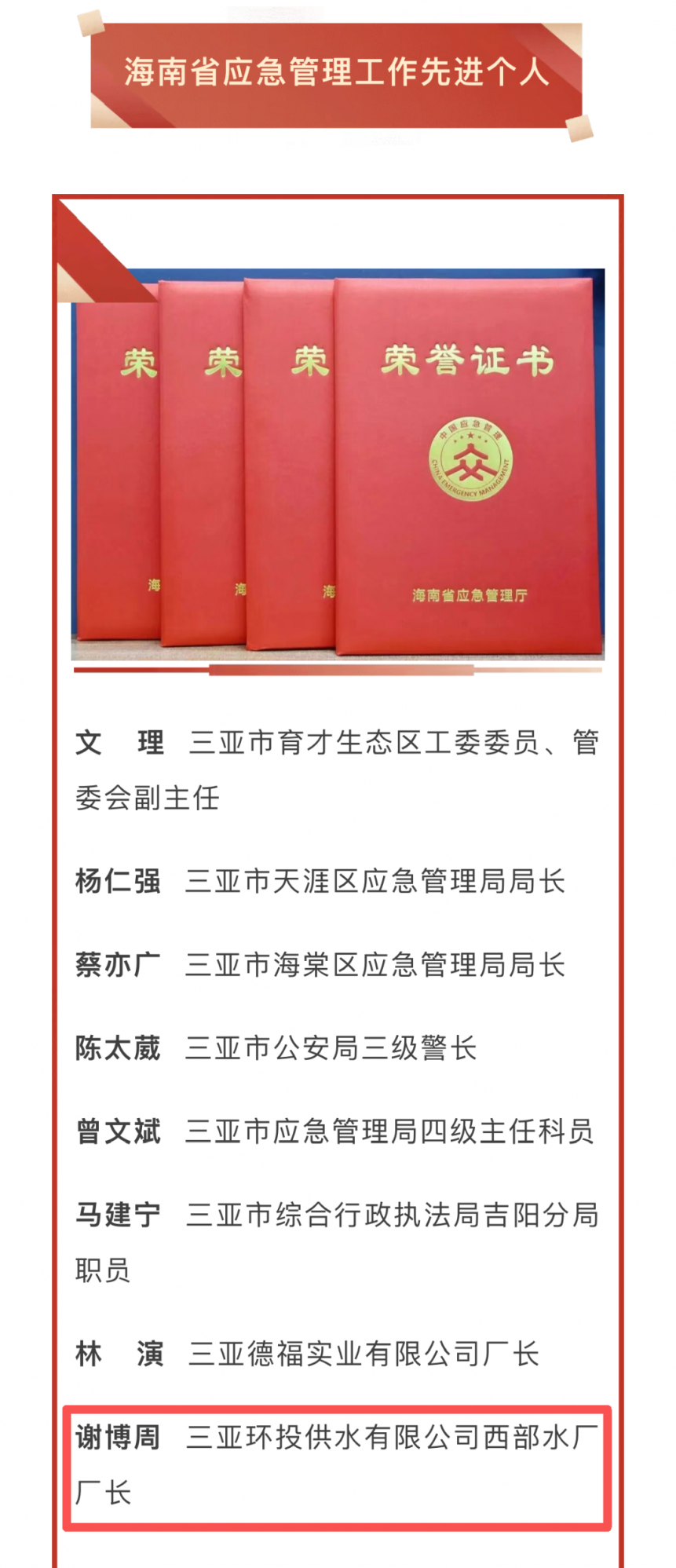 近日,海南省應(yīng)急管理廳公布全省應(yīng)急管理工作先進(jìn)集體和先進(jìn)個(gè)人名單,對(duì)在全省應(yīng)急管理領(lǐng)域作出突出貢獻(xiàn)的集體與個(gè)人予以表彰。其中,三亞環(huán)農(nóng)集團(tuán)旗下三亞環(huán)投供水有限公司西部水廠廠長(zhǎng)謝博周榮獲“海南省應(yīng)急管理工作先進(jìn)個(gè)人”稱(chēng)號(hào)。